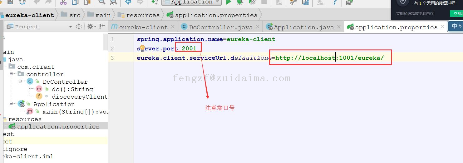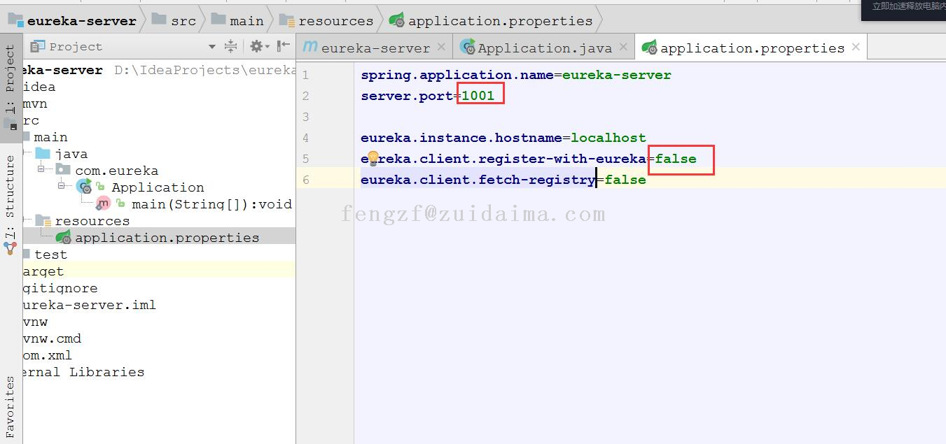 在默认设置下,该服务注册中心也会将自己作为客户端来尝试注册它自己,所以我们需要禁用它的客户端注册行为,只需要在application.properties配置文件中增加如下信息: