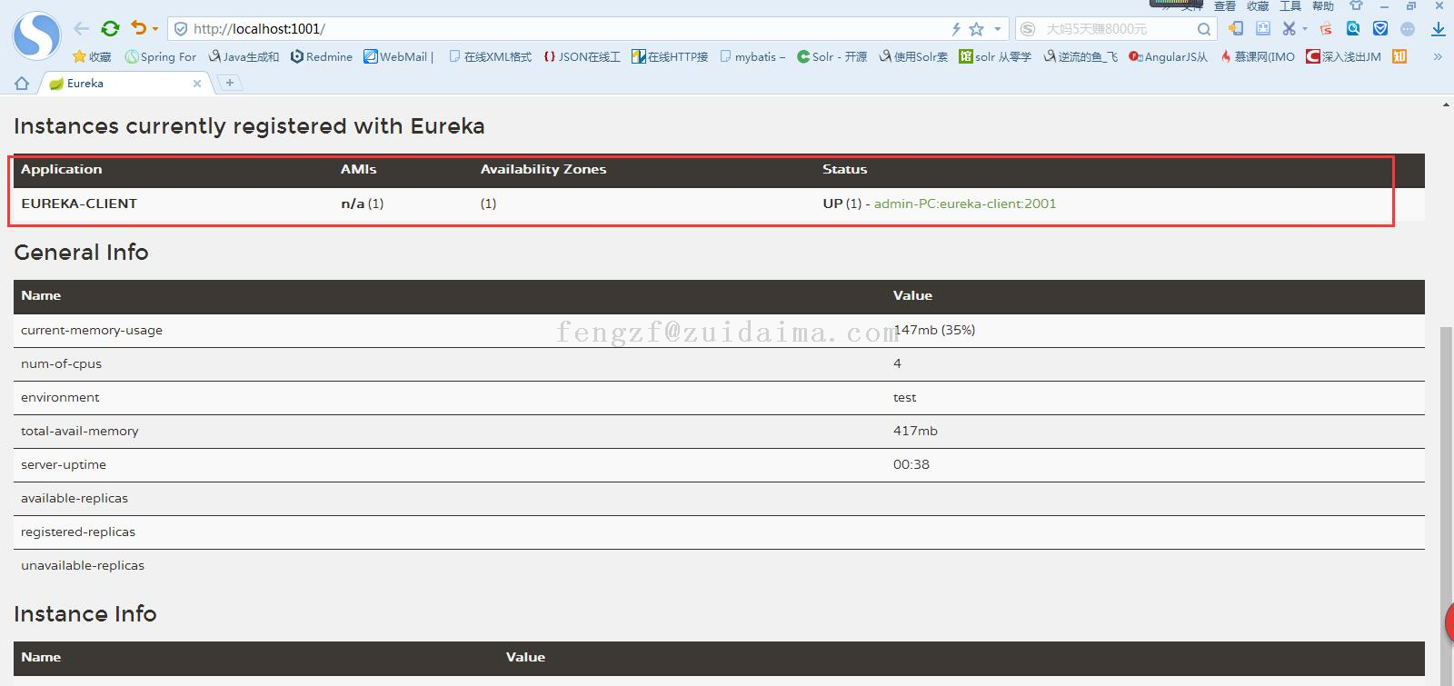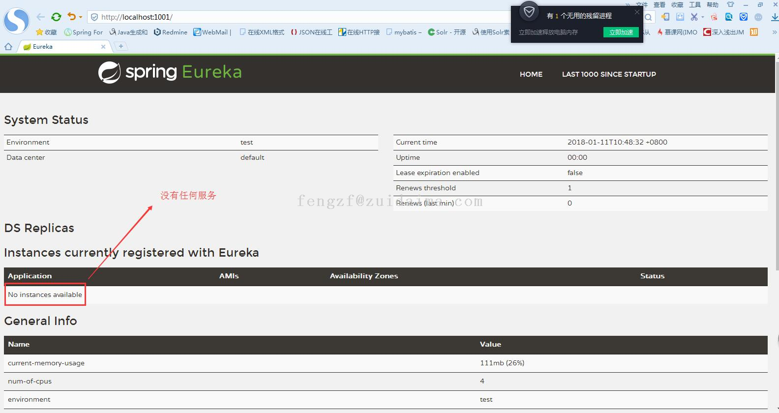 为了与后续要进行注册的服务区分,这里将服务注册中心的端口通过server.port属性设置为1001。启动工程后(直接执行Application中的main方法就行,这里没有tomcat什么事),访问:http://localhost:1001/,可以看到下面的页面,其中还没有发现任何服务。