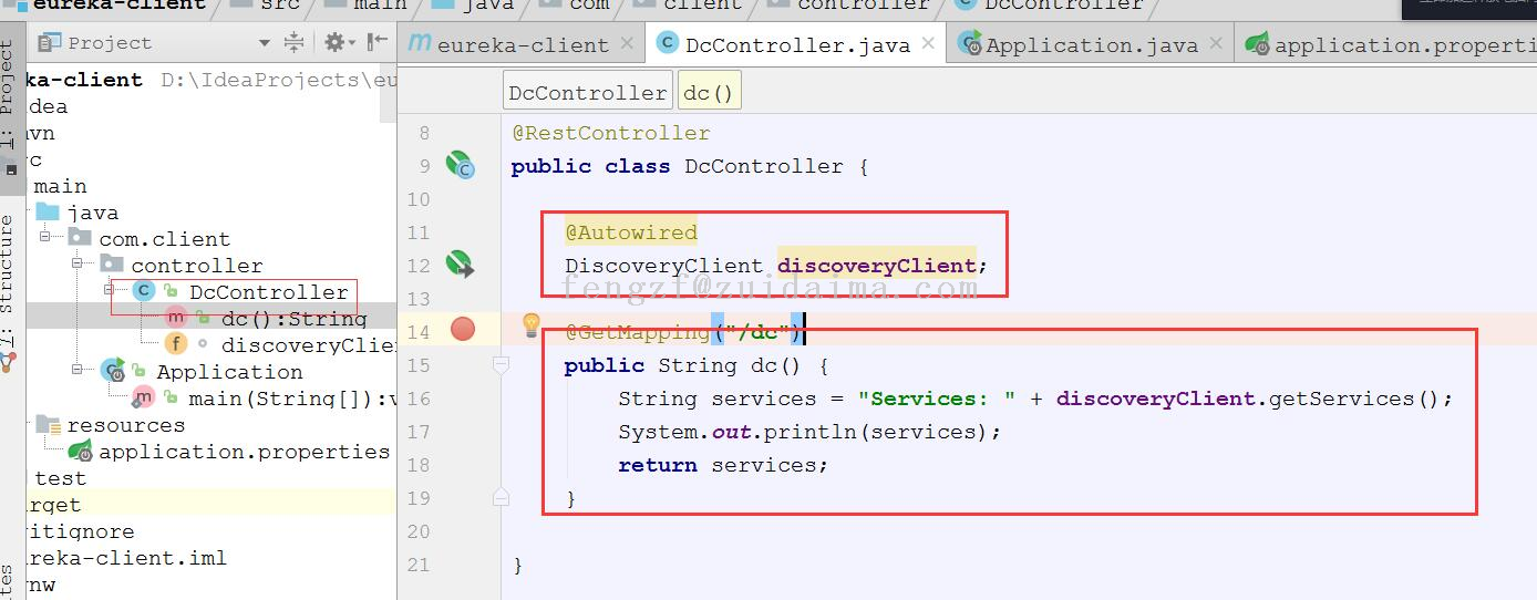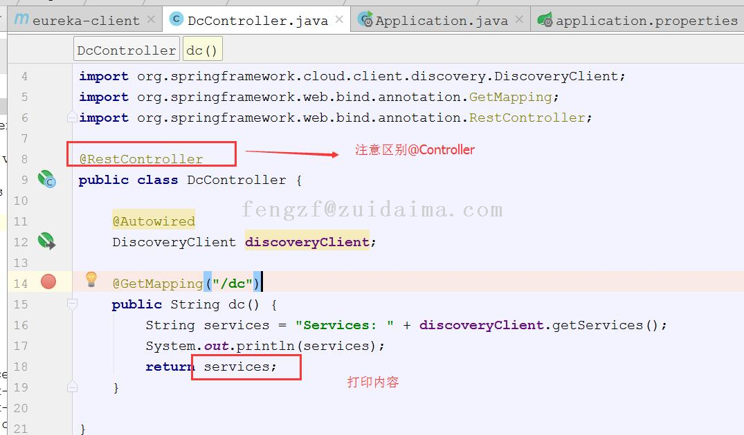 其次,实现/dc请求处理接口,通过DiscoveryClient对象,在日志中打印出服务实例的相关内容。