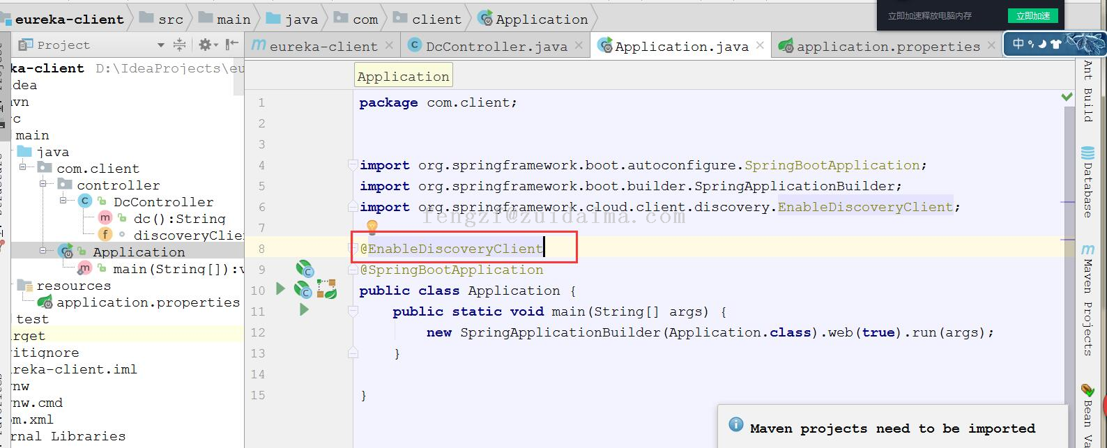 最后在应用主类中通过加上@EnableDiscoveryClient注解,该注解能激活Eureka中的DiscoveryClient实现,这样才能实现Controller中对服务信息的输出。