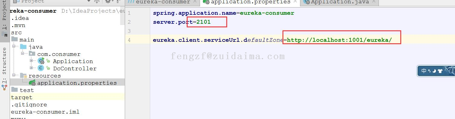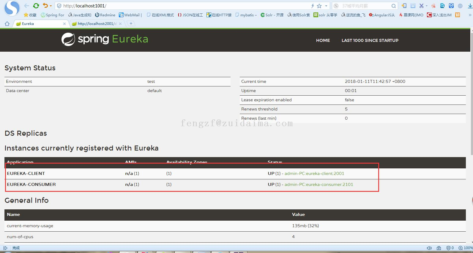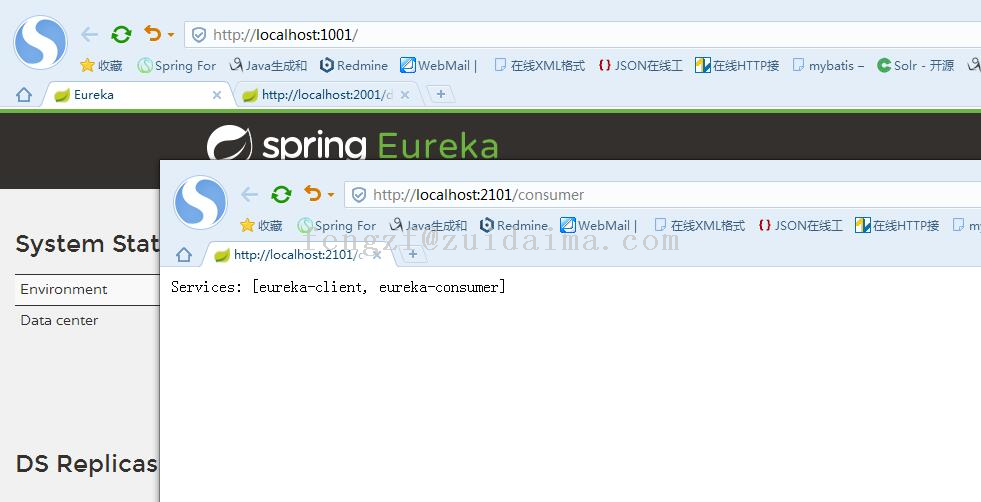 在完成了上面你的代码编写之后,将eureka-server、eureka-client、eureka-consumer都启动起来,然后访问http://localhost:2101/consumer ,来跟踪观察eureka-consumer服务是如何消费eureka-client服务的/dc接口的。