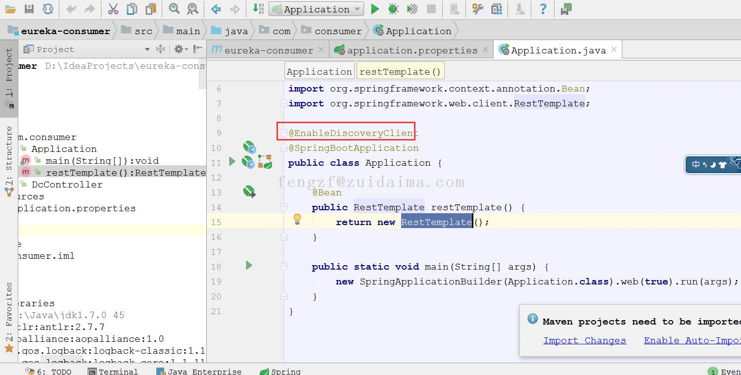 创建应用主类。初始化RestTemplate,用来真正发起REST请求。@EnableDiscoveryClient注解用来将当前应用加入到服务治理体系中。