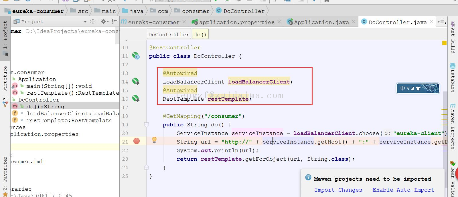 注入了LoadBalancerClient和RestTemplate,并在/consumer接口的实现中,先通过loadBalancerClient的choose函数来负载均衡的选出一个eureka-client的服务实例,这个服务实例的基本信息存储在ServiceInstance中,然后通过这些对象中的信息拼接出访问/dc接口的详细地址,最后再利用RestTemplate对象实现对服务提供者接口的调用。
